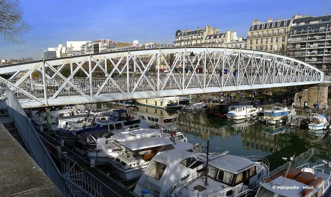 There’s nothing monumental about the bridge. It’s a simple structure spanning the canal of the Port de l’Arsenal, overlooking moored boats. The water is calm, the boats line the edges, and trees frame the view on both sides. It’s one of the quieter corners of this part of Paris.
